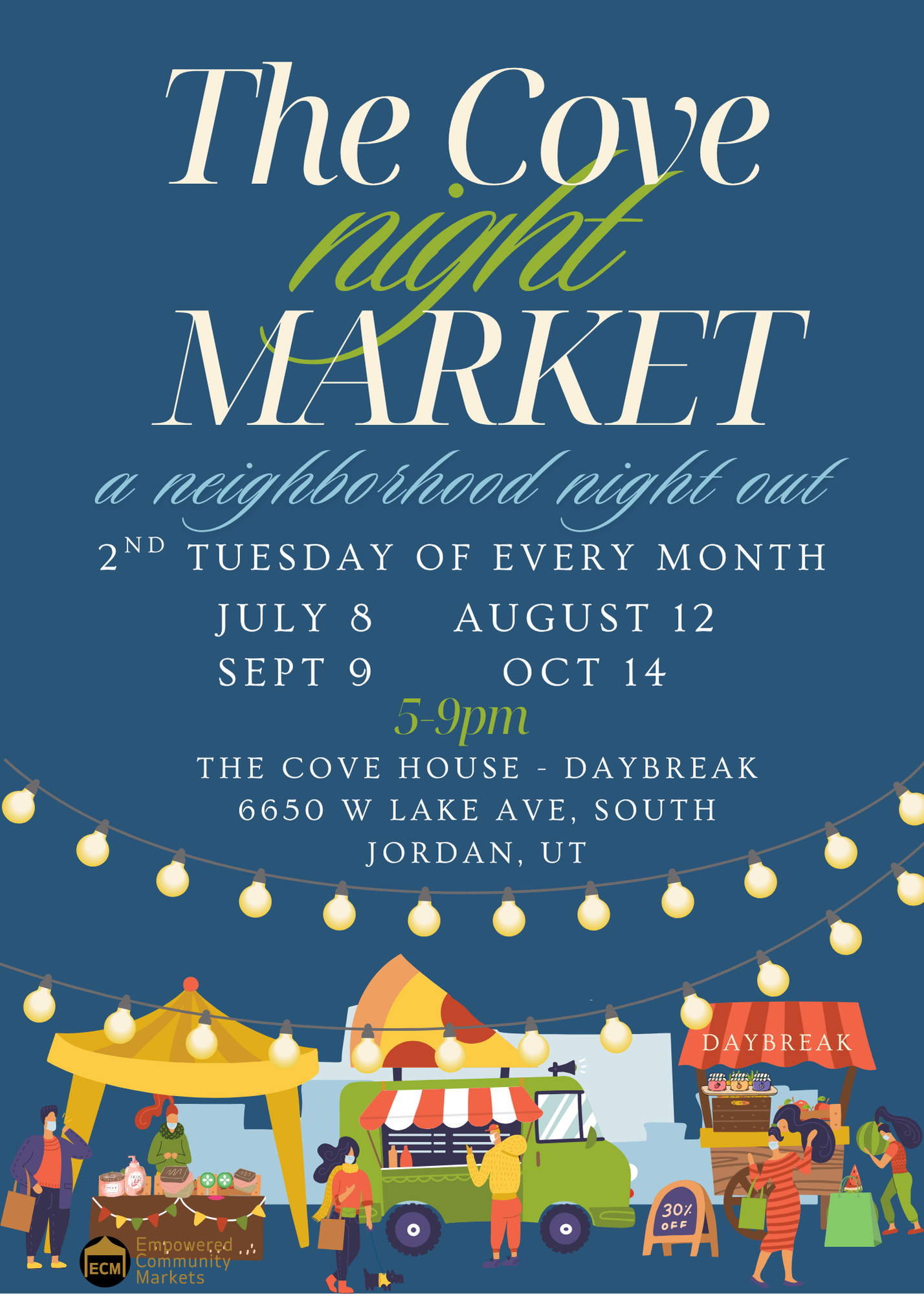 The 2nd Tuesday of each month, July - September, The Cove Market will bring The Cove to life. Join us for an evening of food, shopping, music, neighbors, and fun!